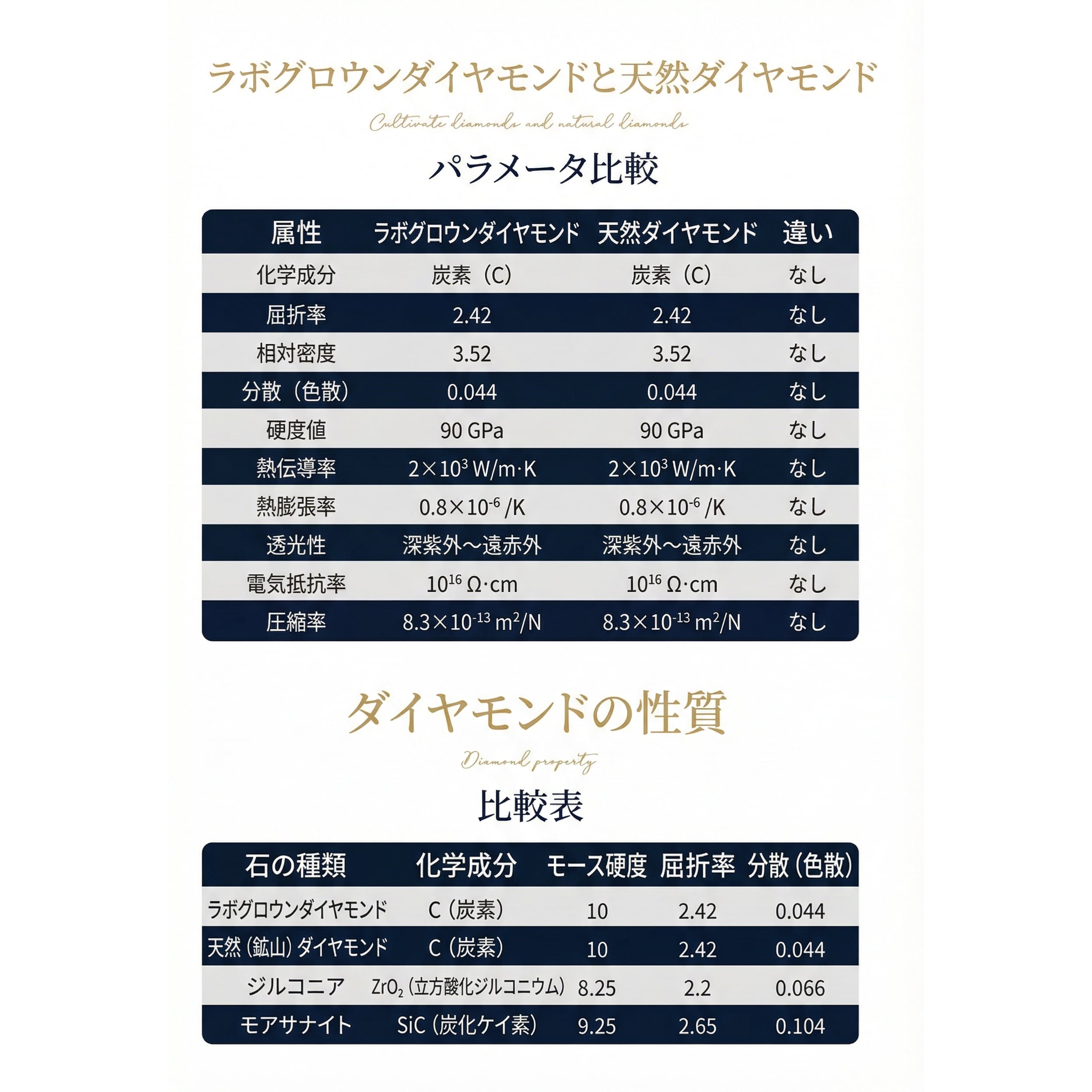 物理的性質・化学成分・輝き(光学特性)は天然ダイヤモンドと同一で、見た目や輝きも区別がつきません。