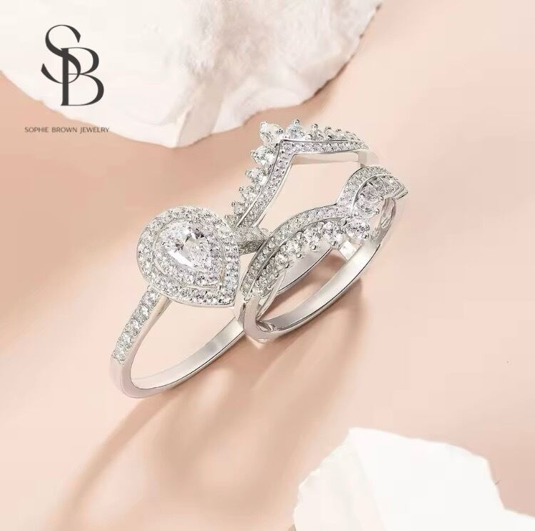 3本セット ペアシェイプカット AAAAA キュービックジルコニア ダブルヘイローリング キラキラ S925 ゴージャス ラグジュアリー 指輪 ウェディング ダイヤモンド メレ 重ね付け ホワイト ドロップ | SOPHIE BROWN