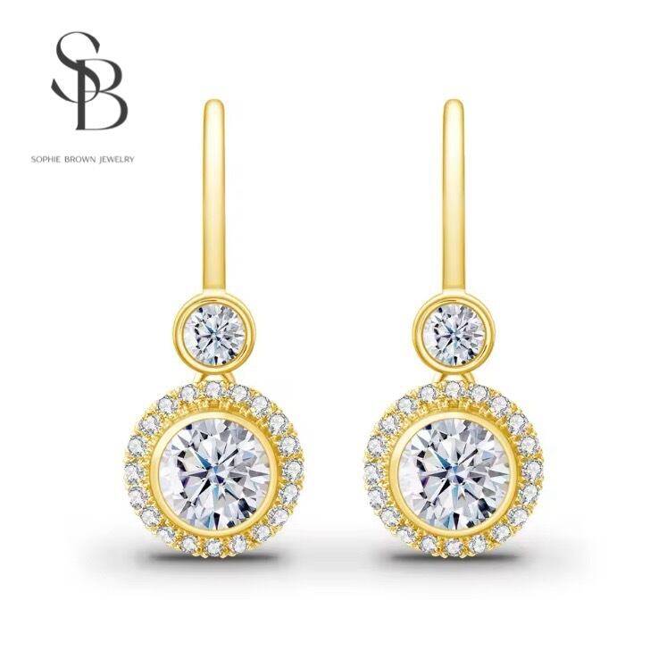 モアッサナイト ラウンド フックピアス キラキラ シルバー925 ラグジュアリー ゴージャス ウェディング クラシック モアサナイト ダイヤモンド ホワイト ダングルピアス 大きめ ヘイローピアス ベゼルセッティング イエローゴールド | SOPHIE BROWN