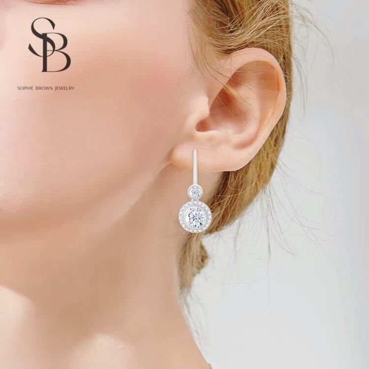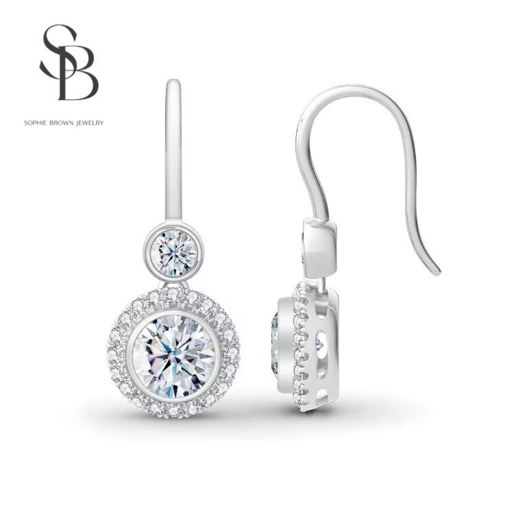 モアッサナイト ラウンド フックピアス キラキラ シルバー925 ラグジュアリー ゴージャス ウェディング クラシック モアサナイト ダイヤモンド ホワイト ダングルピアス 大きめ ヘイローピアス ベゼルセッティング | SOPHIE BROWN