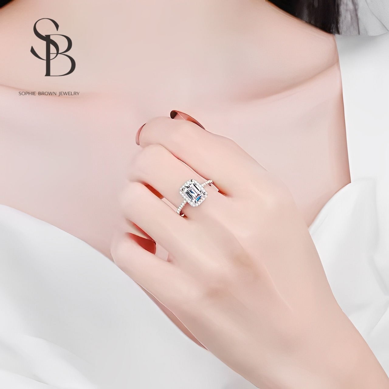 モアッサナイト エメラルドカット 1ct/2ct ヘイローリング キラキラ シルバー925 ゴージャス 指輪 ウェディング エンゲージリング モアサナイト ダイヤモンド ラグジュアリー メレタイプ ホワイト | SOPHIE BROWN